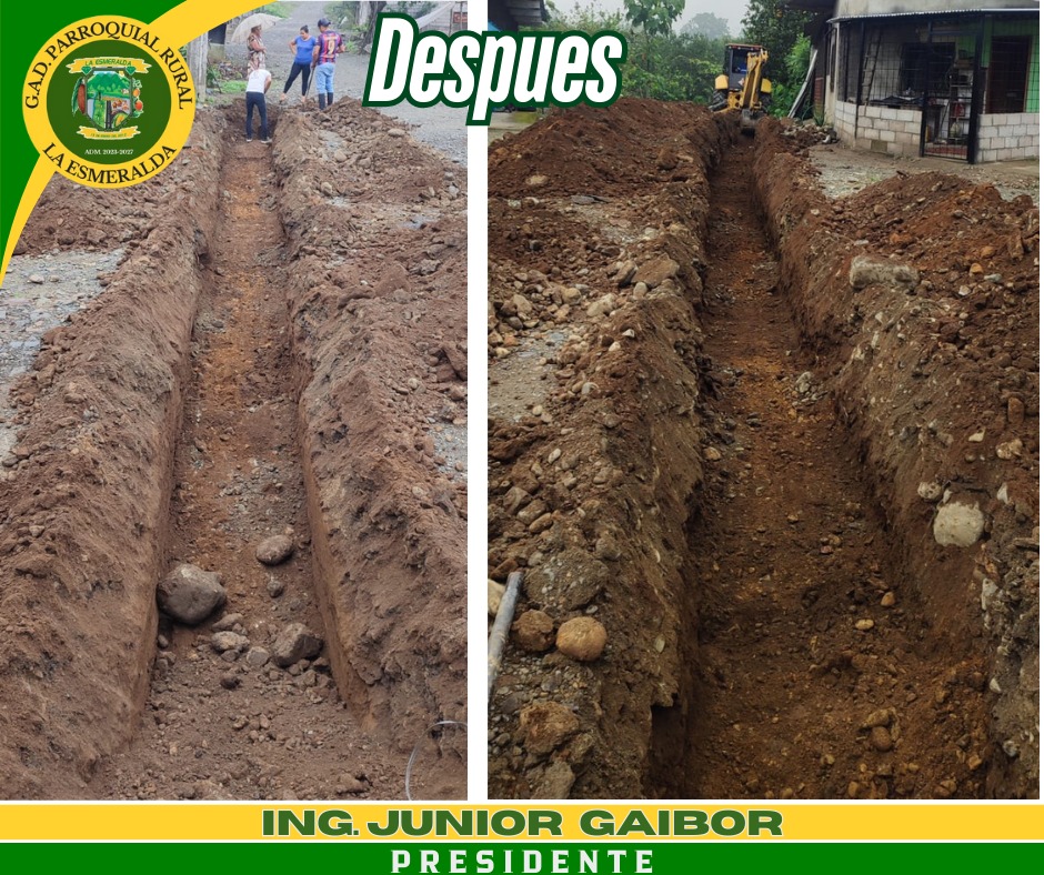 Con la maquinaria del GAD, se llevó a cabo la excavación y colocación de tuberías de agua en el centro de la parroquia La Esmeralda.
